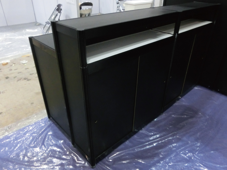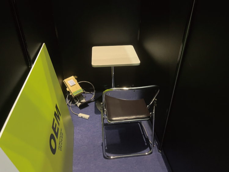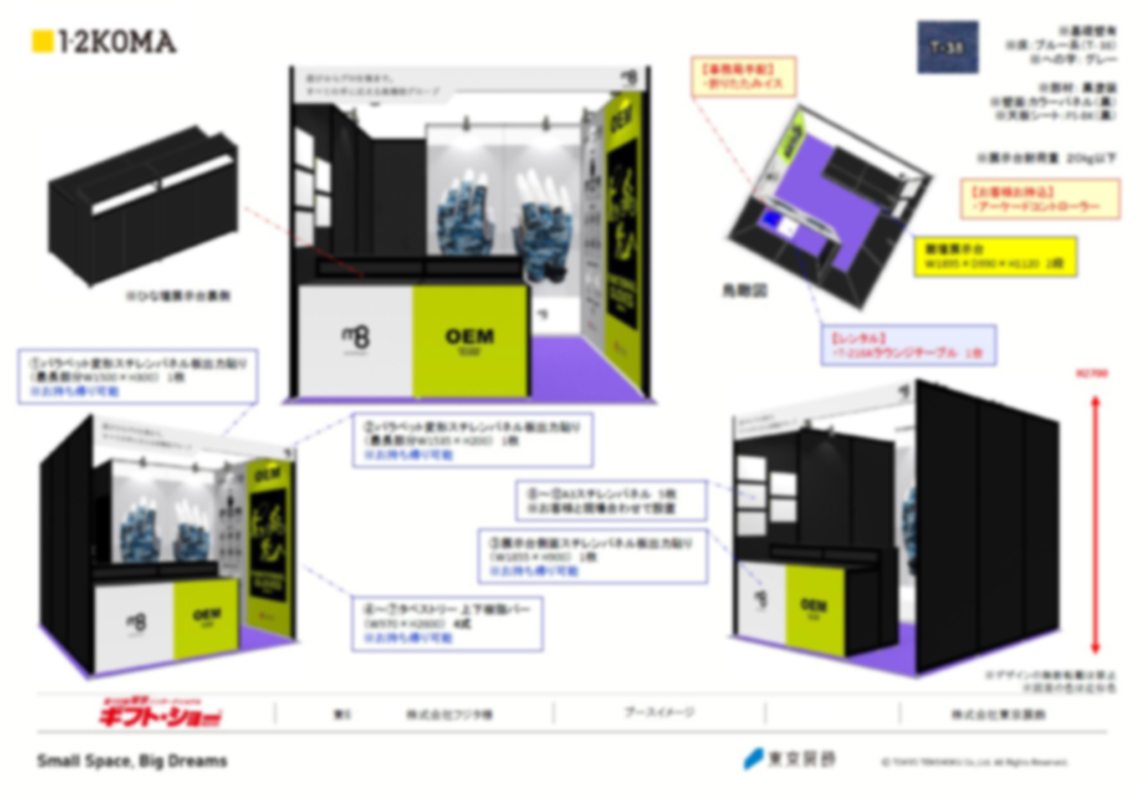また、当初は木工ブースもご検討されていたので、システムの部材ができるだけ見えないよう、黒い部材と黒いパネルをはめ込み、その上からスチレンパネルを貼る案をご提案しました。