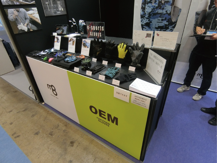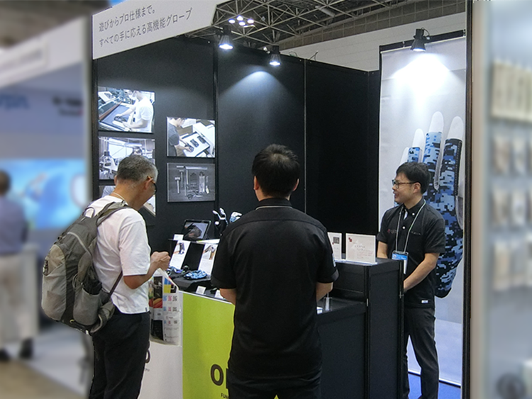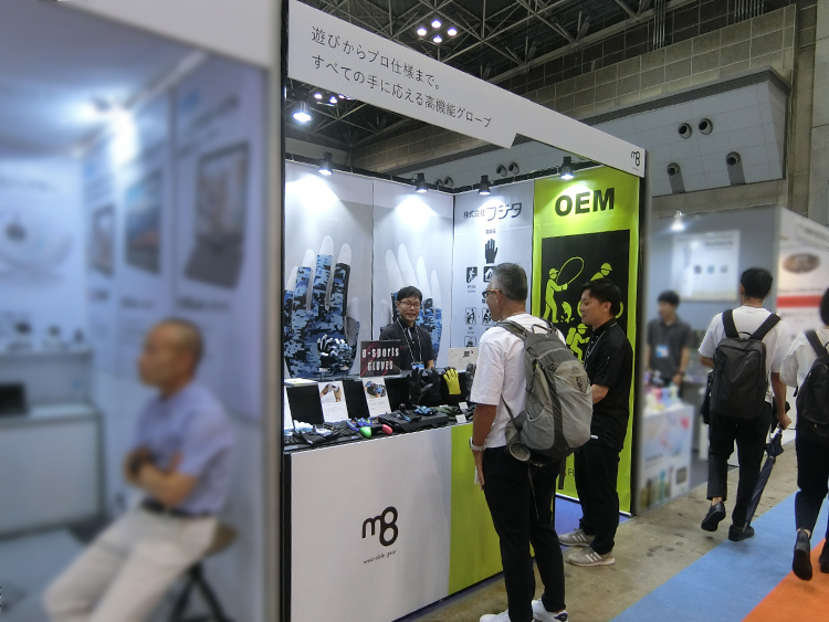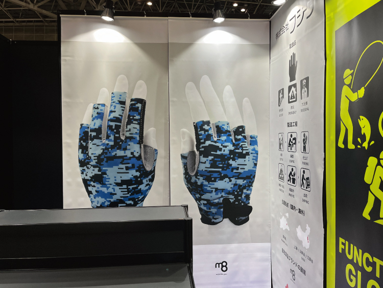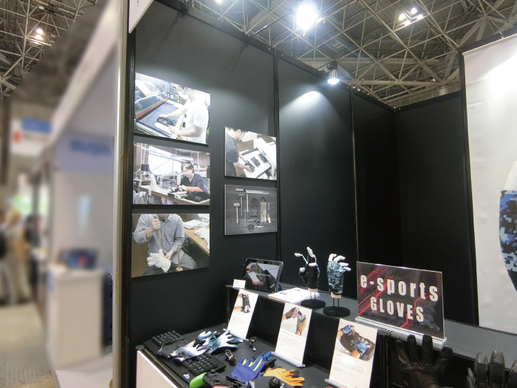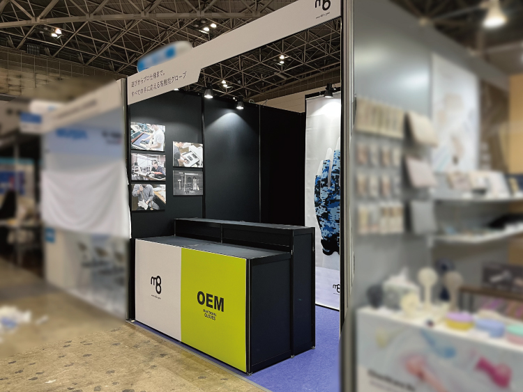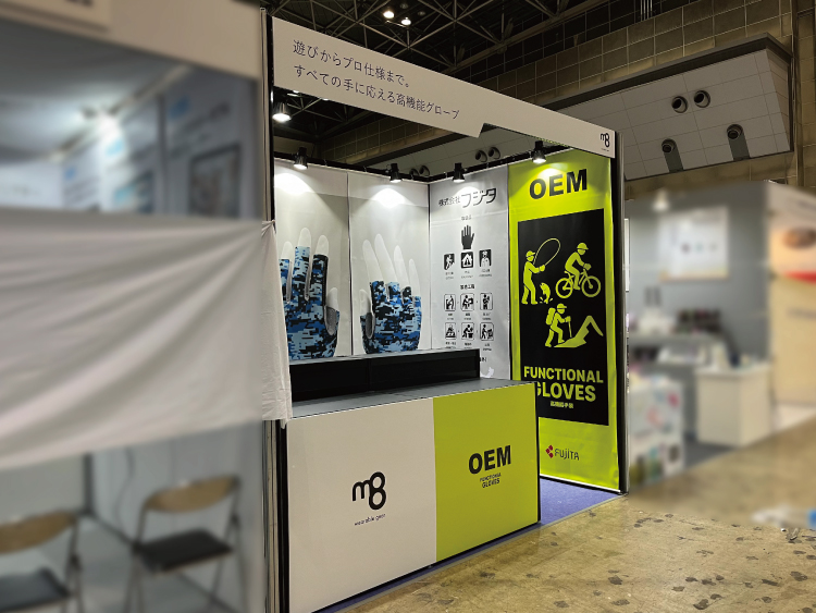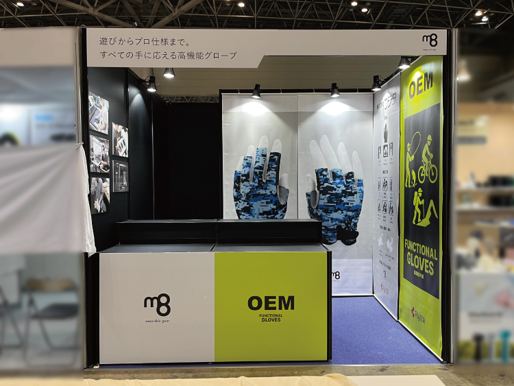 また、一面開放ということもあり、「何を扱っているか一目で分かるブースにしたい」とのご要望でした。そのため、ご提案時に仮デザインとして、タペストリーにグローブを大きく出力した案をご提示しました。この仮案はインパクトがあるとのことで、そのままご採用いただきました。